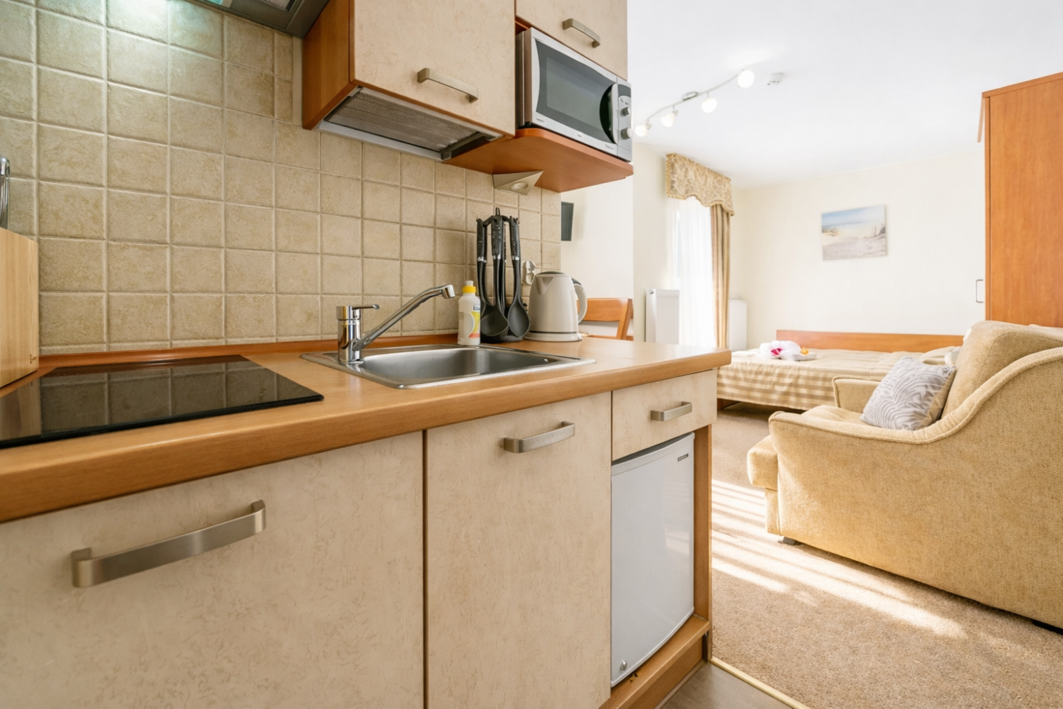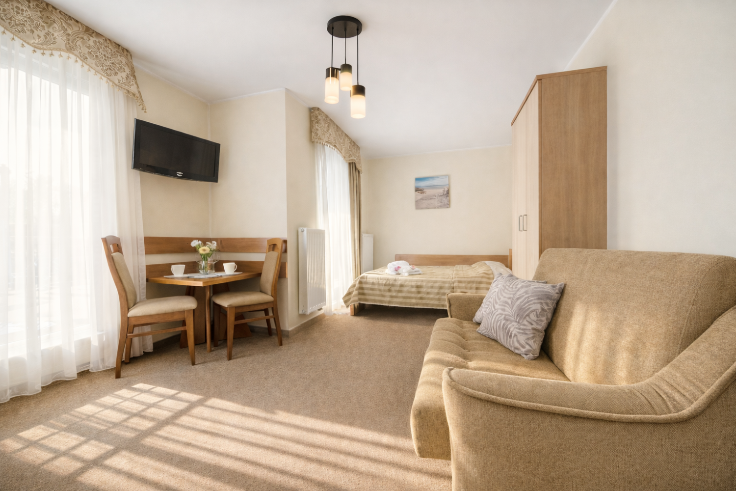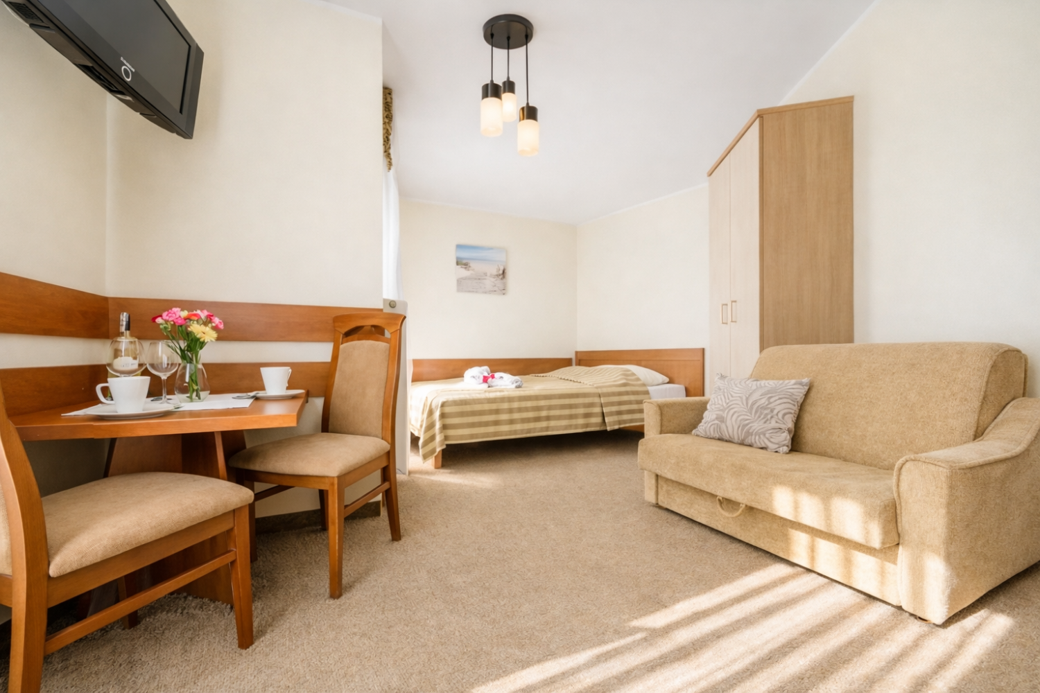 Pokój został wyposażony w łoże małżeńskie, sofą wypoczynkową oraz obejmujący w pełni wyposażony aneks kuchenny oraz łazienkę.